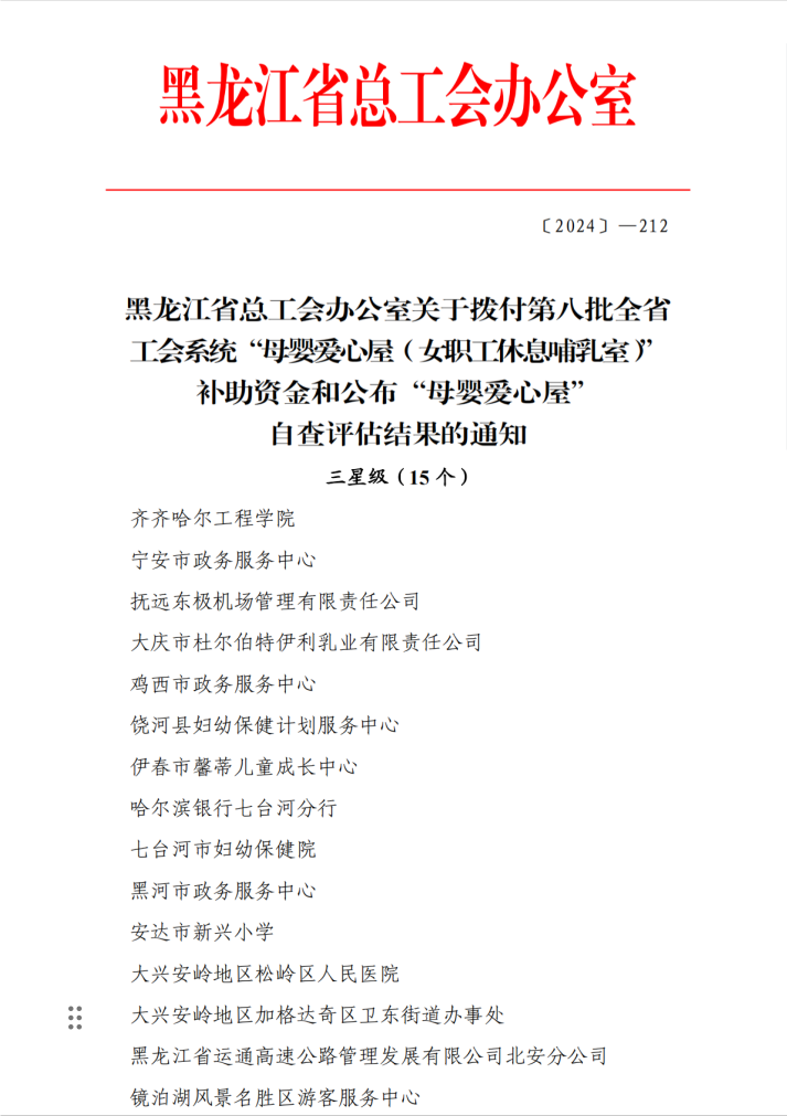 近日,黑龙江省总工会公布“母婴爱心屋”评估结果,学校获评2024年全省工会系统“三星级”母婴爱心屋(女职工休息哺乳室)。全省30家获评单位中,beat365是唯一一所高校。