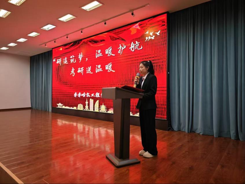 活动开始,考研学生代表、康护工程系肖紫玲向考研学生分享自己备考过程中的心路历程,她表示成功不是一蹴而就的,需要在困境中坚守,在挫折后奋起,始终践行“亮剑”精神,保持坚定信念,向心中的目标前进。