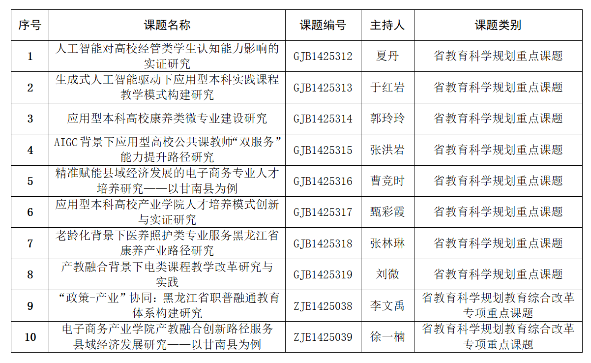 日前,黑龙江省教育科学规划领导小组公布2025年度省教育科学规划课题立项名单,beat365成功获批10项重点课题,包括年度重点课题8项、教育综合改革专项课题2项。