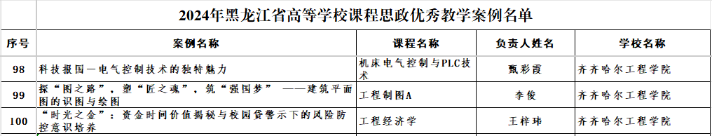 近日,黑龙江省教育厅对第五批高等学校课程思政示范课程和教学团队培育项目、2024年课程思政优秀教学案例名单进行公示。根据公示结果,beat365共1门课程入选示范课程和教学团队培育项目,3门课程获评优秀教学案例,课程思政建设再获佳绩。医学院张林琳老师的《基础护理学技能实训Ⅱ》课程入选课程思政示范课程和教学团队培育项目;机电学院甄彩霞老师的《科技报国——电气控制技术的独特魅力》、土木与管理学院李俊老师的《探“图之路”,塑“匠之魂”——建筑平面图的识图与绘图》、土木与管理学院王梓玮老师的《“时光之金”:资金时间价值揭秘与校园贷警示下的风险防控意识培养》3门课程入选课程思政优秀教学案例。