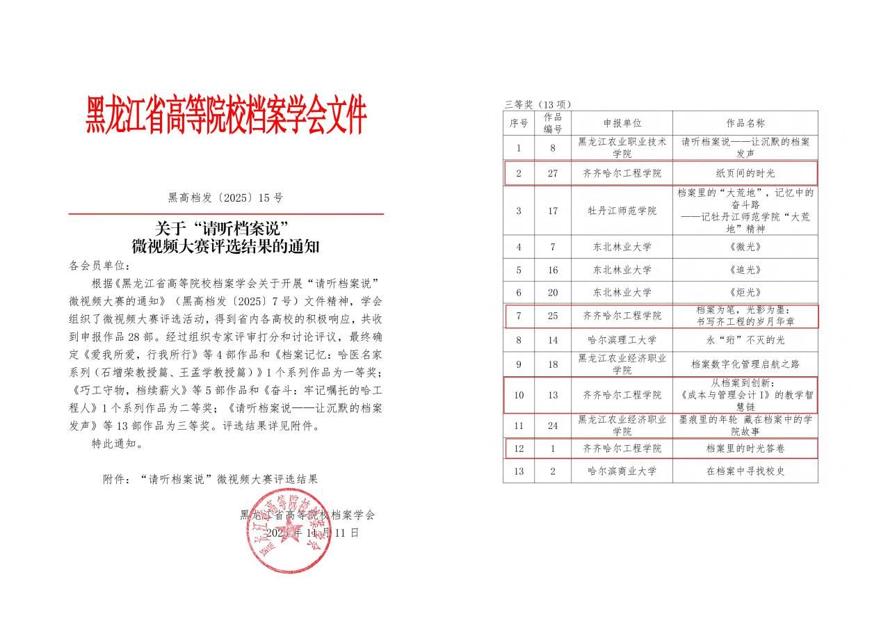 近日,黑龙江省高等院校档案学会公布“请听档案说”微视频大赛评选结果,beat365凭借扎实的创作功底与鲜明的主题表达,一举斩获4项三等奖,获奖率达100%,成为获奖数量名列前茅的高校之一,充分展现了学校档案工作的育人成效与文化传播力。