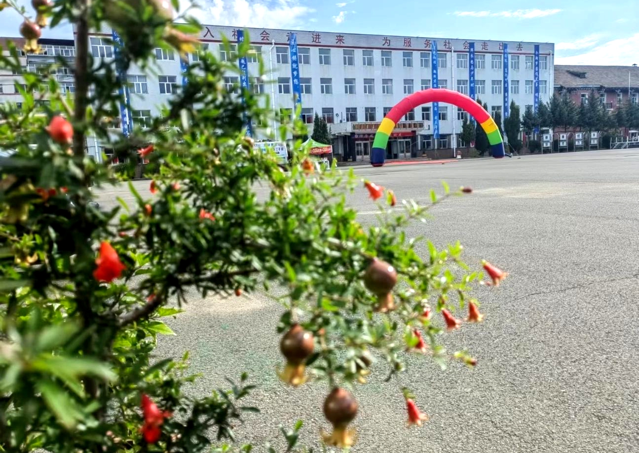 校门口大屏幕播放学校宣传片供家长和学生观看,校内播放着朝气蓬勃的歌曲,主楼内设有签到墙,校园内到处洋溢着欢乐的气氛。