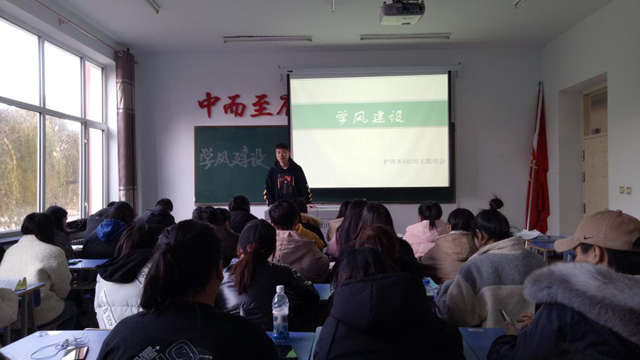11月7日,护理学182班召开“学风建设”主题班会。班长刘宏超对本学期以来的班级工作进行简要总结,反思了自身在工作上和学习上的不足。刘洁同学和李艳同学先后上前与大家分享学习体会和学习方法,班团支书郑蕊针对近期状况希望同学们明礼修身,严格自律,辅导员刘丽娜老师向同学们传达了教育部《关于深化本科教育教学改革 全面提高人才培养质量的意见》精神。