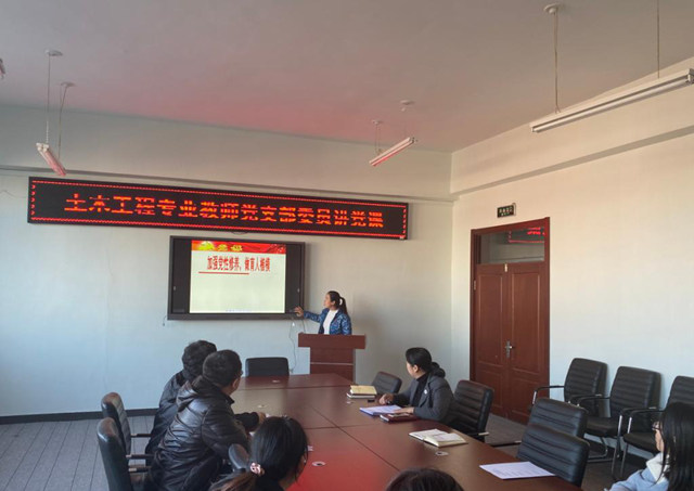 11月15日上午,土木工程专业教师党支部委员徐明、钟美慧,分别为党员上党课。徐明同志以《加强党性修养做育人楷模》为题,谈到作为党员时刻要不忘初心、牢记使命,甘于奉献,切实担负起新时代教师的责任。钟美慧同志以《立德树人是教育的根本任务》为题,谈到教师自身的涵养和言传身教在“立德树人”中的重要性,作为党员教师要守住责任,为把学生培养成为建设中国特色社会主义的合格接班人而努力。