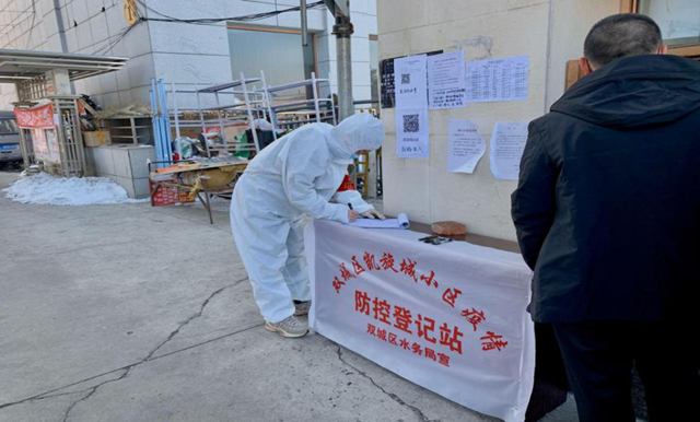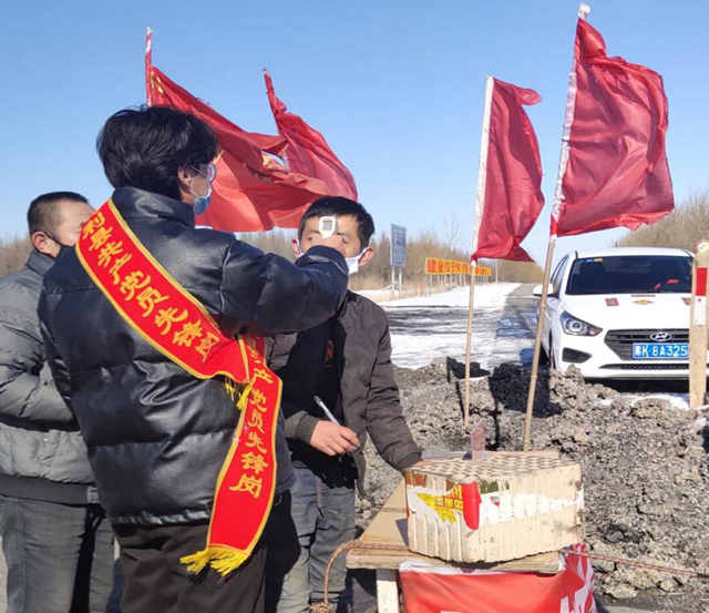 土木191班团员耿闯在哈尔滨市双城区做疫情防控志愿者,主要工作是对来往人员进行信息登记。
