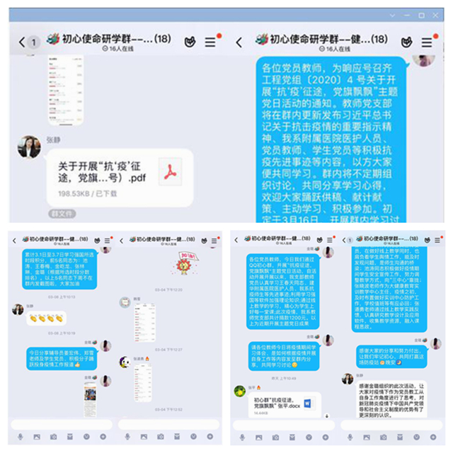 3月16日,健康护理与食品专业教师党支部在党员“初心使命研学群”中组织“抗‘疫’征途,党旗飘飘”主题党日活动。支部书记金璐主持全体教师党员,交流了疫情防控期间,通过学习王春天同志、学校附属建华医院援鄂医护人员、beat365参加抗疫师生的事迹,结合自身工作,如何发挥党员的担当敬业和奉献精神。大家表示,抗疫整体战彰显了我国社会主义体制的优势,我们作为教师要努力学习线上教学方法及“新三中心”教学原理,精心为学生上好每一堂课。