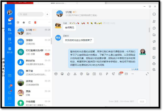 二是及时反馈学生的各项学习数据,做到勤督促。教师课下利用钉钉群、QQ群发布学生任务点、作业学习完成情况,并做到勤督促;学生在课下对学习或作业中的问题随时向教师提问,教师及时解答,为学生提供一个良好的交流渠道。