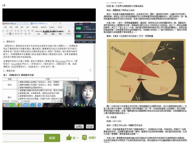 ——教师的课前。一是知识点录播。由于《招贴设计》课程线上教学资源相对较少,所以采用教师提前录播知识点的形式,对教学内容精细化讲解。每个知识点的讲解时间控制在5-15分钟,减少学生疲劳、厌学情况出现,同时采取露脸的方式录播,让学生在自学的时候也有课堂的紧张感。二是编辑文本知识点,为学生编写“电子书”。三是丰富学习通课程资源,创建讨论、测试模块,上传课件、经典招贴案例,带着学生“见多识广”,逐步拓展学生的创意思维。课前做足,教师做好“领进门”。