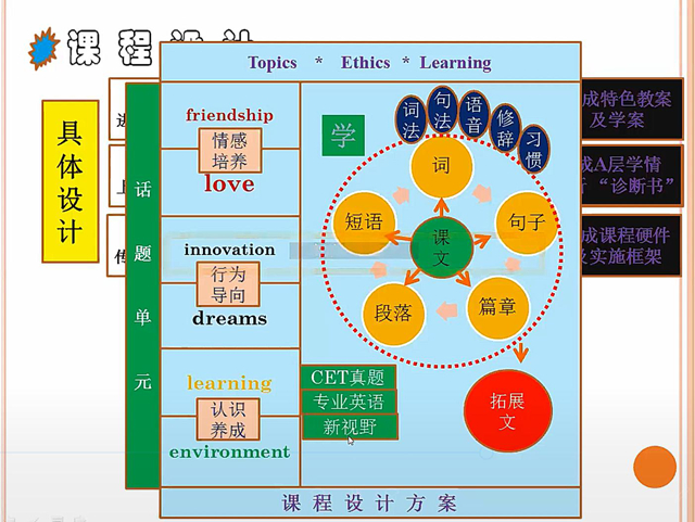 吴庆娟老师的《综合英语IV》课程分享,其特点是:课程定位准确;课程设计清晰合理,课程重构中融入了线上慕课,尝试线上线下混合式教学,具有一定创新性;课程实施中,通过以赛促学的形式,有效开展教育教学活动,充分践行了“手把手、放开手、育巧手”的理念。