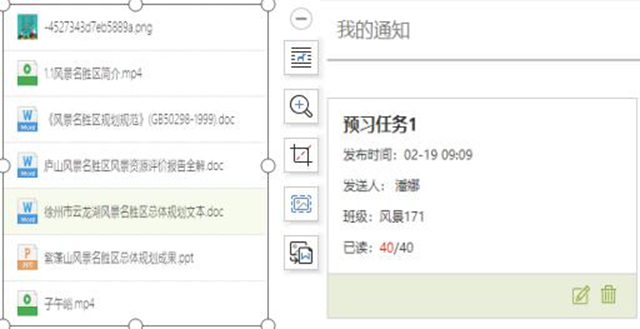 (一)课程资料。以学生为中心,参照脑科学原理、布鲁姆法则进行课程设计,布置《风景区规划设计》课程目录。提前布置预习任务,在学习通平台布置电子教材、趣味视频、多个真实风景区项目设计方案、案例任务点,将学习任务前置,引导学生提前自学。