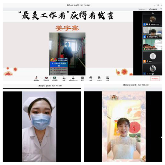 师生们共同回顾欣赏了反映本次活动的优秀作品,同学们利用课余时间,以不同形式展现了南丁格尔精神和当代大学生朝气蓬勃的风貌。系“形象大使”获得者、2019届毕业生郭金娜同学,在所录制的视频中与学弟学妹们分享了自己参加疫情防控的经历和感受,鼓励大家扎实学习专业知识,夯实专业操作技能基础。“最美工作者”获得者、护理学195班姜宇鑫同学在发言中,交流分享了自己主动请缨加入小区疫情防控志愿者队伍,为居民普及疫情防控相关知识,提供生活便利,得到居民认可的经历和感受。