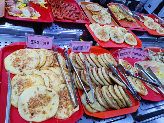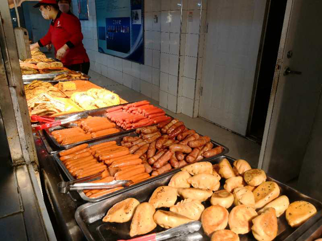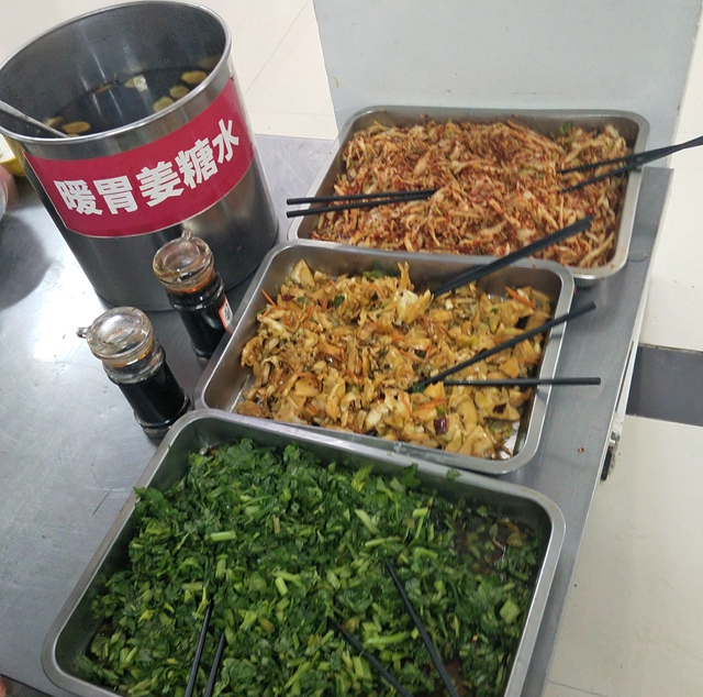 张女士是2015年就进校做餐饮工作的。她说,最近和过去不同的是菜肴偏清淡了些,因为咱们这边老人和老师多一些,另外,南方的同学们也喜欢清淡点儿的;这里的早餐,有免费豆浆、粥、小咸菜,中午有免费的汤,还有米饭和饼。