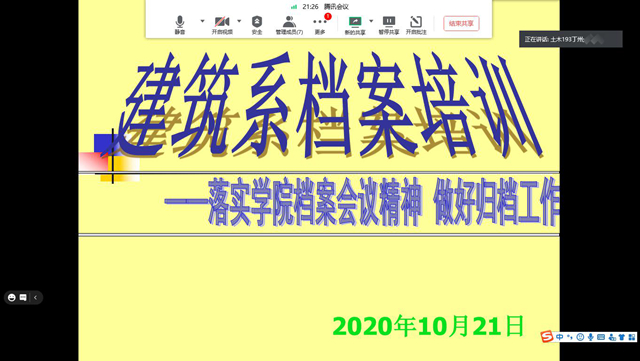 10月21日中午,建筑工程系兼职档案员李月凤老师在线对本系23名班级档案员进行档案工作培训。她为班级档案员介绍系档案工作的现状,结合实际强调档案工作的重要性及注意事项,详细讲解了档案的收集、整理方法及流程,并与就各班档案收集过程中的具体问题进行指导,希望班级档案员高标准、高质量完成班级档案收集、整理及归档工作。