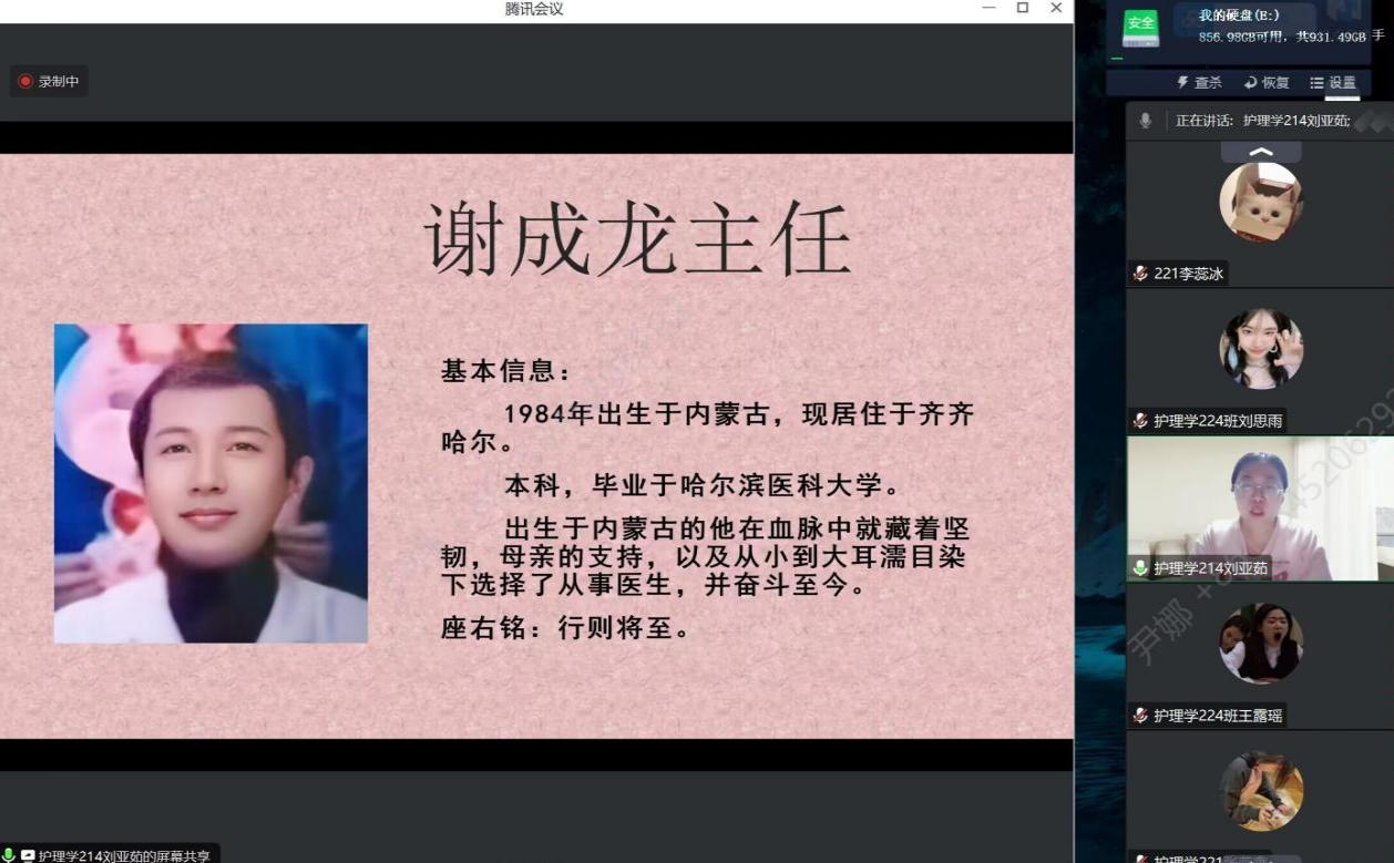 7月21日晚,为学习先进典型,更好地践行专业实践学期实习,健康与护理系仲泰医院实习组在线召开“学习先进典型 汲取榜样力量”典型医务人员思政案例汇报大赛。指导教师及全体实习学生参加,专业教师尹娜、基础部大学语文教师王春凤担任本次比赛评委,护理学224班刘金迪主持。
