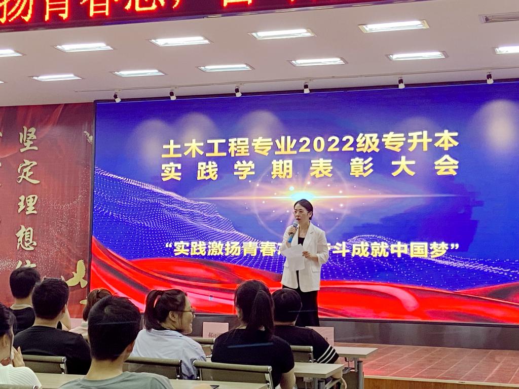 首先,教学副主任郝丽娜对专升本专业实践学期进行了总结。她表示,专业实践学期为学生提供真实的职业环境,在真实的职业环境中真学、真做,掌握真本领;同学是带着书本上的知识走进企业,带着体认和反思回到课堂的。