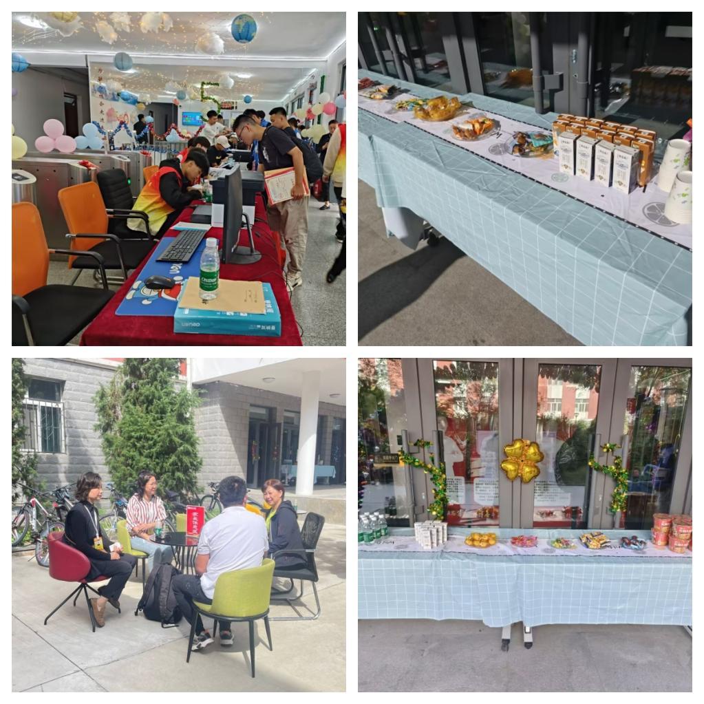在五公寓、九公寓迎新点设置了家长休息区和茶歇处,为新生和家长提供暖心服务。五公寓门前还布置了打卡点,便于新生和家长拍照留念,大厅设立报到处,接待新生打印报到单,办理入住。