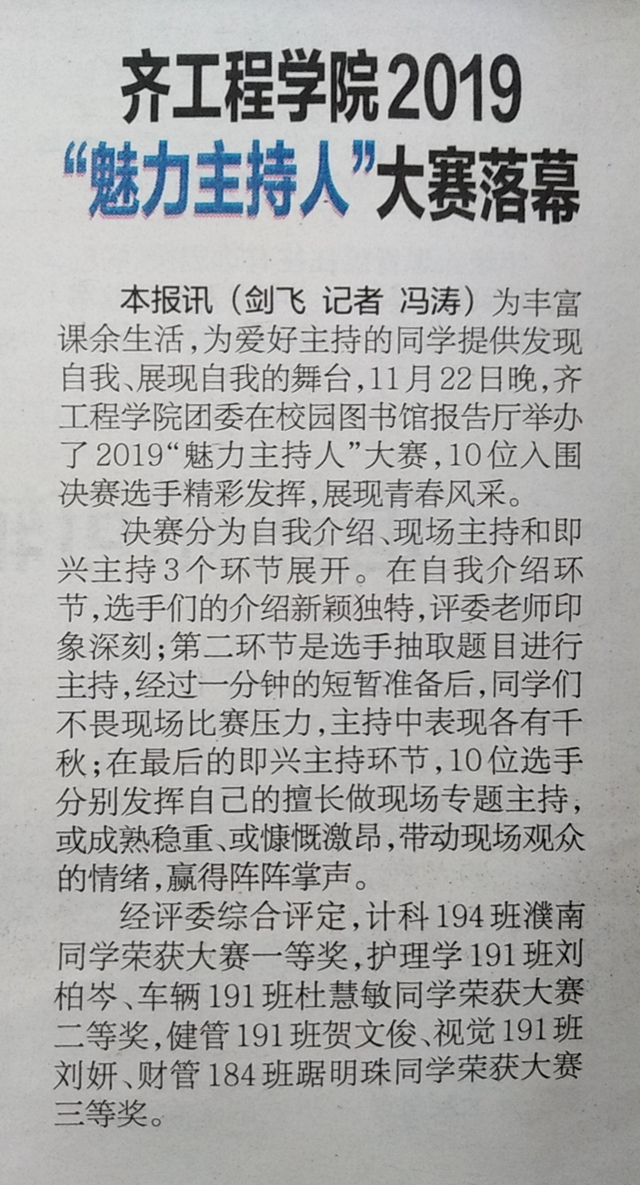 鹤城晚报:齐工程学院2019“魅力主持人”大赛落幕