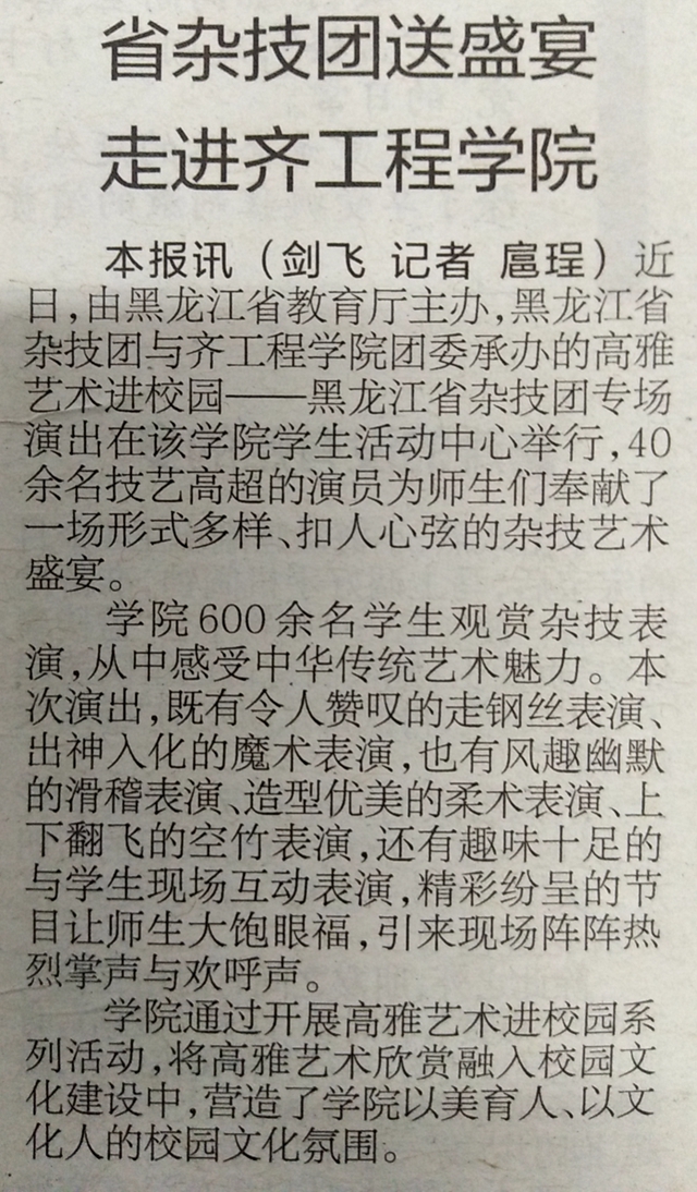 鹤城晚报:省杂技团送盛宴走进齐工程学院