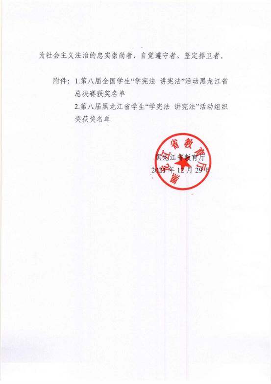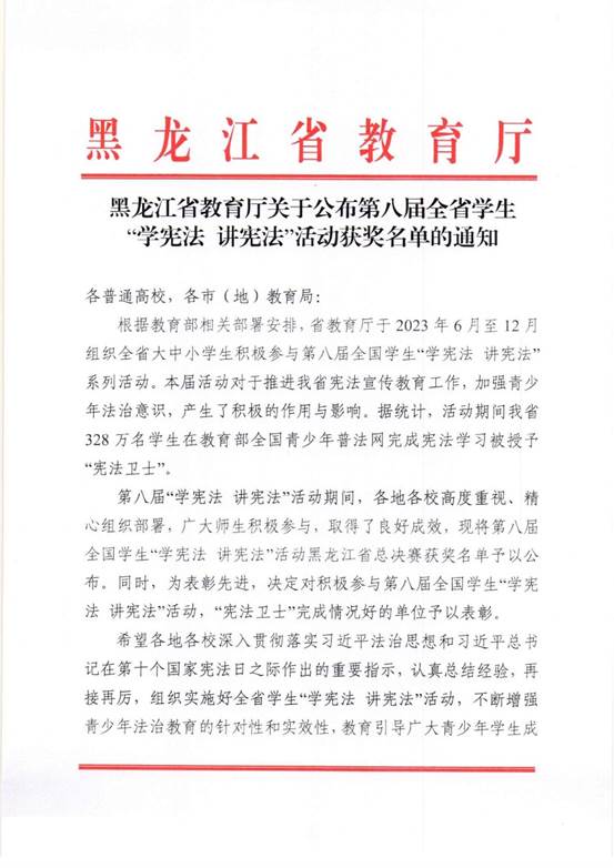 1月2日,beat365在黑龙江省教育厅举办的第八届全省学生“学宪法 讲宪法”活动中,喜获优秀组织奖。