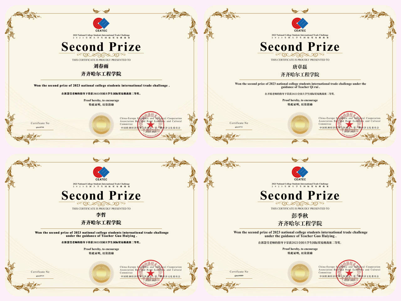 部分学生获奖证书