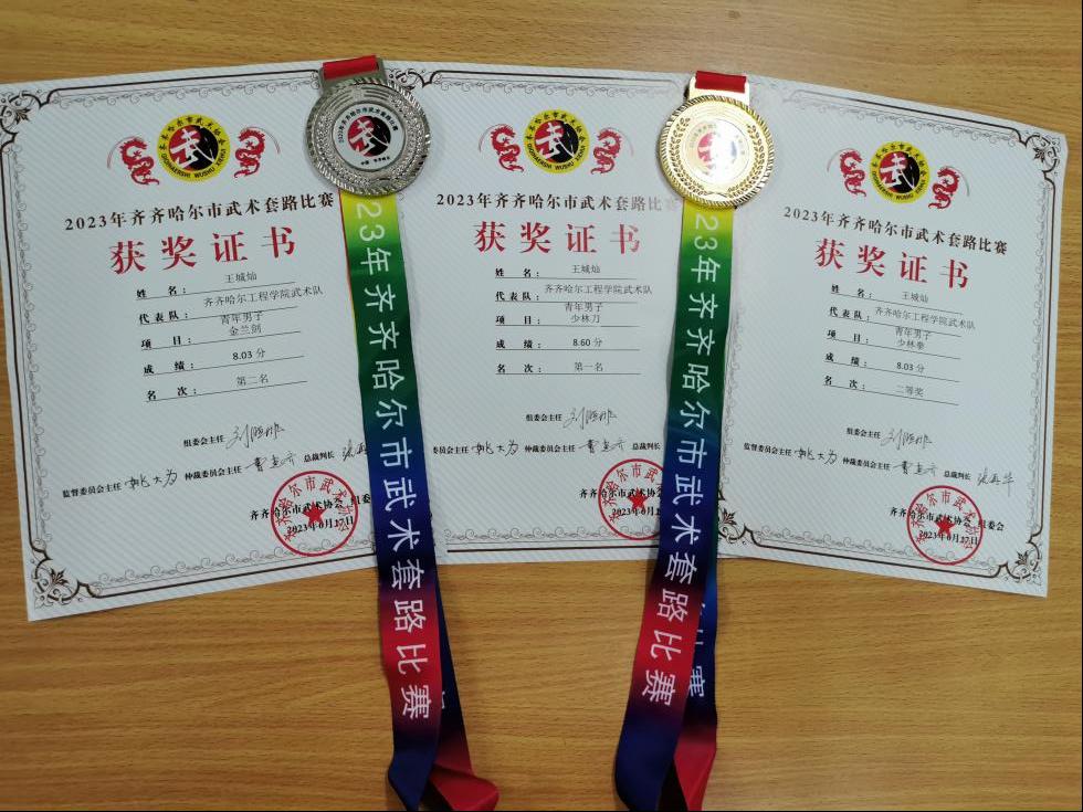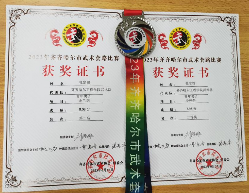 电科211班杜宗翰获青年男子组金兰剑银牌、少林拳二等奖。
