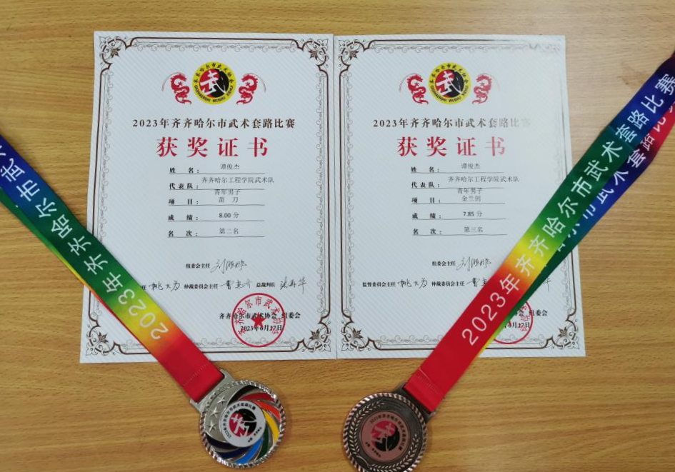电气223班谭俊杰获青年男子组苗刀银牌、金兰剑铜牌。