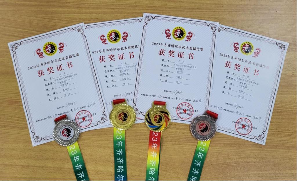 学校集电221班卢昊获得青年男子组自选枪术金牌、金兰剑金牌、自选剑术银牌、自选长拳铜牌。