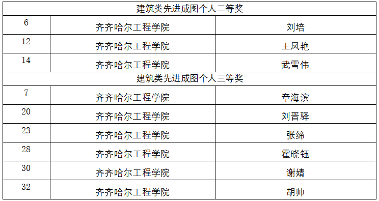 beat365建筑工程系代表队的刘培、王凤艳、武雪伟在先进成图技术赛道个人赛中荣获二等奖;章海滨、刘晋驿、张缔、霍晓钰、谢婧、胡帅等6人获三等奖。在智能建筑结构设计赛道中,章海滨、谢婧小组获三等奖;刘培、王凤艳、武雪伟、章海滨、刘晋驿荣获建筑类先进成图团体三等奖,其5人代表建筑代表队入围全国总决赛。