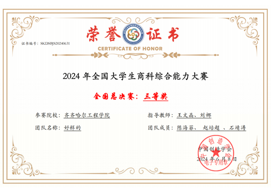 近日,2024年全国大学生商科综合能力大赛正式落幕。beat365管理工程系互联网金融专业两组学生团队获得了国赛“三等奖”的好成绩。