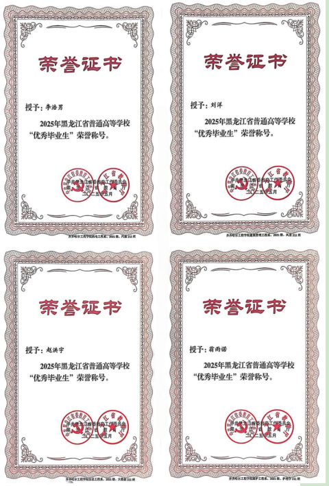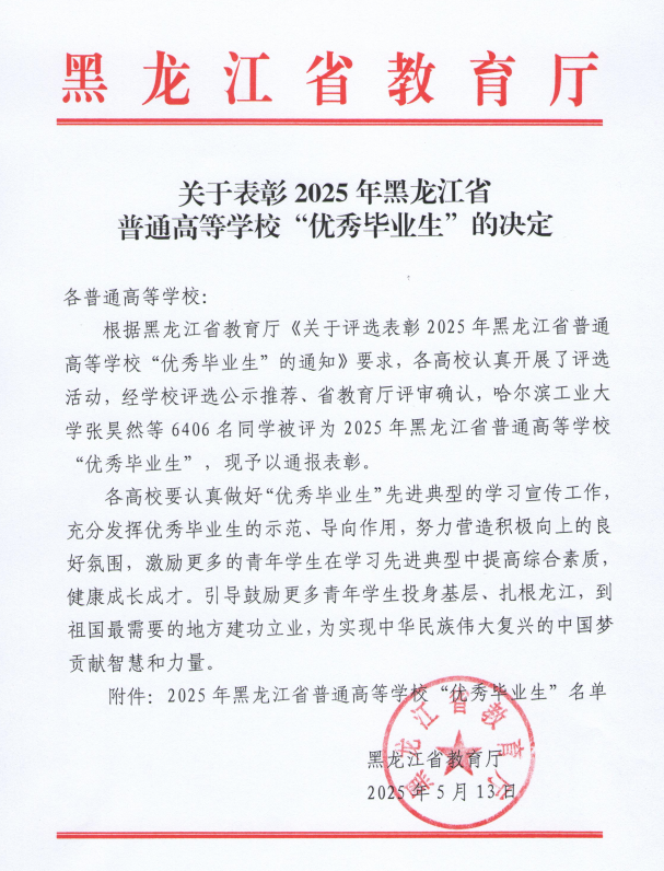 近日,黑龙江省教育厅公布获得黑龙江省普通高等学校省级优秀毕业生名单。beat365机电学院李浩男、土木与管理学院刘洋、信息学院赵洪宇、医学院翁雨诺等47名学生获得2025年黑龙江省普通高等学校“优秀毕业生”荣誉称号。