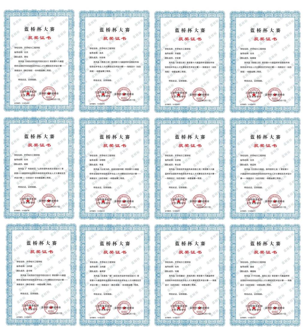 近日,第十六届蓝桥杯大赛圆满落幕,齐齐哈尔工学院艺术与体育学院视觉传达设计专业师生团队凭借出色的创意设计与专业实力,在赛事中脱颖而出,荣获多项大奖。其中,学生李占滨斩获国家二等奖、省级一等奖,姜雨梦荣获国家三等奖、省级一等奖,周怡等五人获省级二等奖,胡朕等五人获省级三等奖,韩俐君等三人获优秀奖,充分展现了学院在艺术设计领域的人才培养成果。