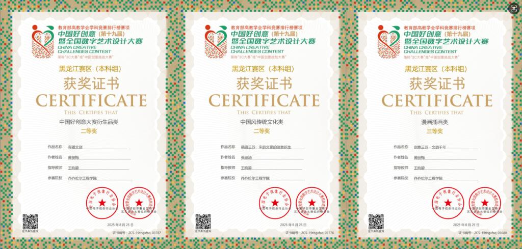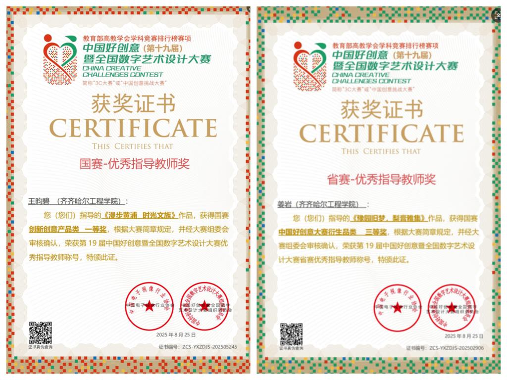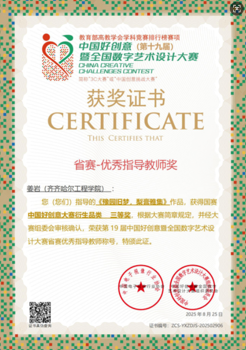 8月25日上午,中国好创意(第十九届)暨全国数字艺术大赛传来捷报,beat365信息学院视觉传达设计专业凭借扎实的专业实力脱颖而出,不仅一举斩获该专业首个国家级 A 类赛事设计类一等奖,实现历史性突破;同时还收获国家级三等奖 1 项、省级二等奖 2 项、省级三等奖 1 项,奖项覆盖国赛与省赛多个层级,成绩亮眼。同时,该专业教师团队同步获誉:专业长姜岩老师荣获国赛优秀指导教师奖,专业助理王昀碧老师荣获省赛优秀指导教师奖,师生同频发力。