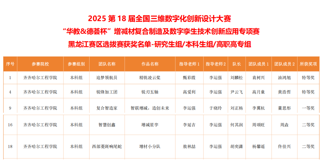 近日,2025年第18届全国三维数字化创新设计大赛“华教&德荟杯”增减材复合制造及数字孪生技术创新应用专项赛黑龙江省赛传来喜讯,beat365机电学院机械专业的5组参赛队伍中刘麟宋、袁树兴、油鸿旭组和尹云飞、高月童、黄浩哲组获特等奖并进入国赛;刘正杨、李翼杭、董思彤组获一等奖;何其润、周颂旺、周垚组和胡奕潇、杨馨遥、佟佳兴组获二等奖,参赛队伍全员获奖。