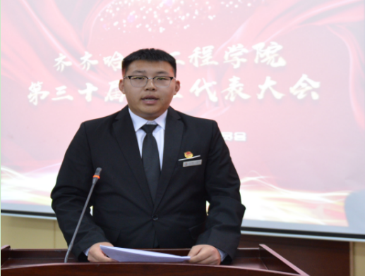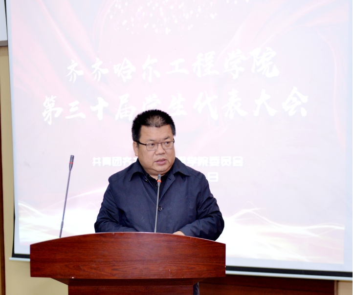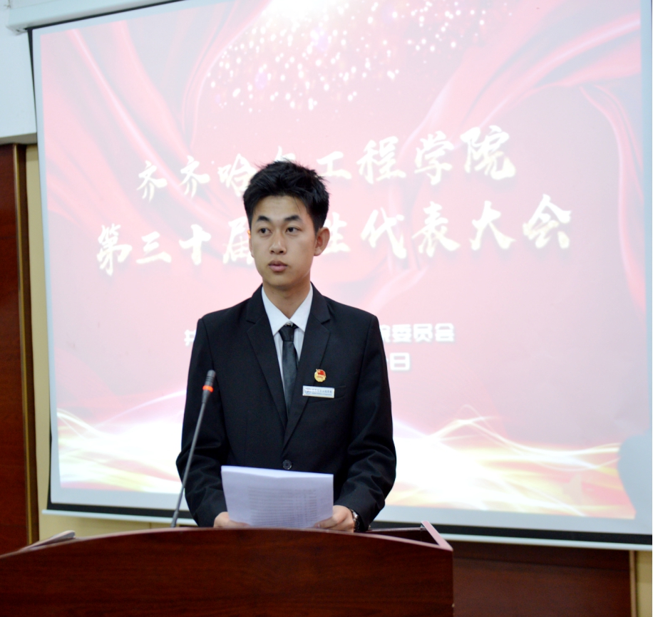 校党委副书记张振笋致开幕词。张副书记首先向大会召开表示热烈地祝贺,充分地肯定了第二十九届学生会在思想政治引领、学风建设、校园文化活动、社会实践、志愿者服务等方面所付出的努力和取得的成绩,并从“筑牢理想信念的基石”“秉持勤奋好学本色”“展现敢于亮剑作风”三个方面,提出了明确要求,张副书记指出,广大青年学生要加强政治理论学习,把自己的小我融入祖国的大我之中,创新理论学习形式,理论联系实际,学以致用。并以“有样、有力、有果”为关键词,就学生干部如何加强自律、坚持创新、履职尽责提出了具体要求。