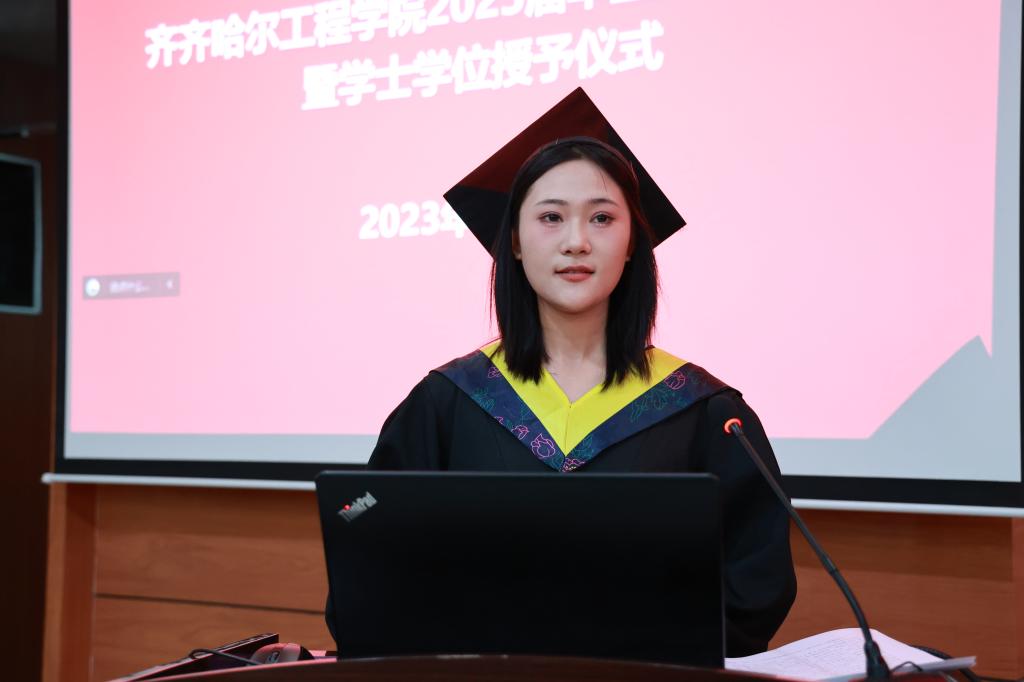 计科192范小倩代表毕业生发言:“大学四年,一路走来何其有幸,遇良师,得挚友,不管走到哪里,我们一生都会铭记学校‘为融入社会走进来,为服务社会走出去’的教育理念,铭记我们留在学校的青春,带着母校给予我们的关爱,走向新的征程。”