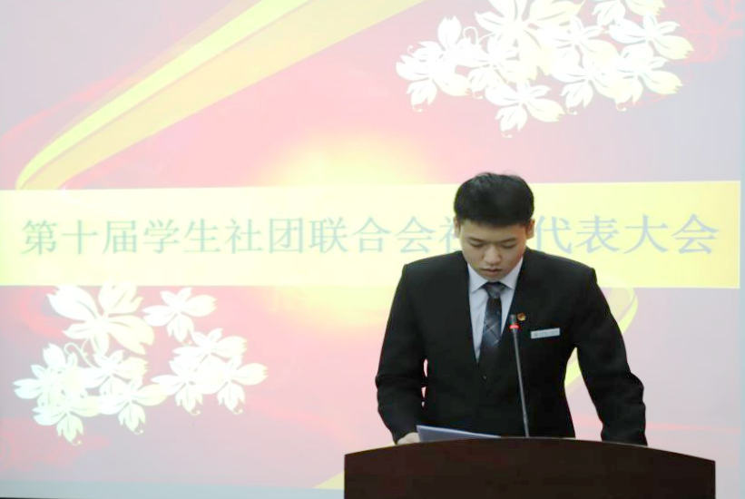 学生社团联合会人力资源部部长刘广志宣读第十届学生社团代表大会总监票人、监票人,总计票人、计票人名单。