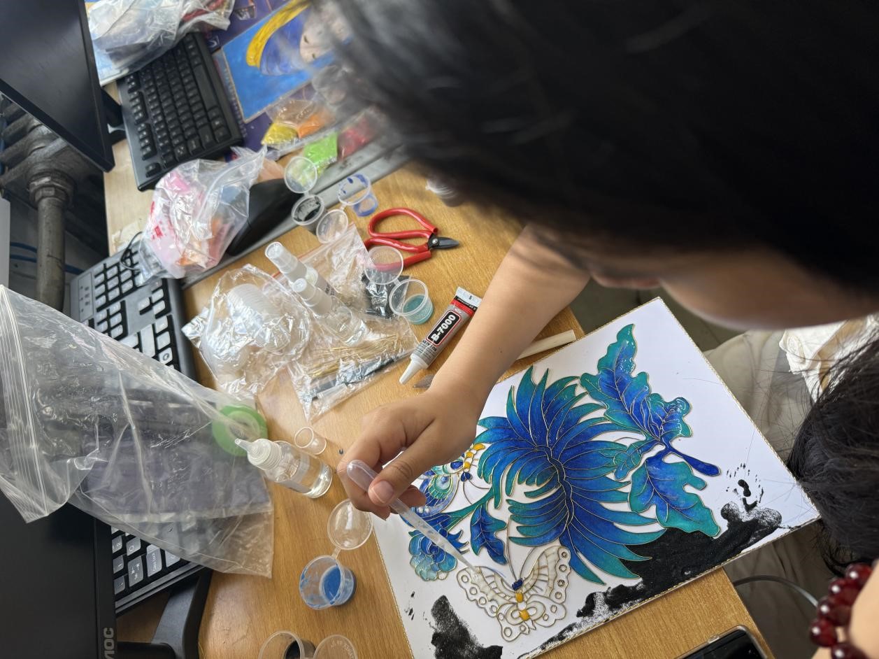 孙晶从掐丝珐琅的历史渊源讲起,通过生动的讲述和珍贵的实物展示,让同学们了解到这一技艺背后承载的深厚文化和世代匠人的匠心独运。她亲自示范了掐丝、点蓝等核心工艺步骤,每一步都精益求精,展现出非遗传承人的高超技艺和对艺术的极致追求。同学们围坐一旁,屏息凝视,生怕错过任何一个细节。讲座最后,孙晶老师鼓励大家动手尝试,将所学知识与个人创意相结合,创作出具有现代审美又不失传统韵味的作品。这一环节极大地激发了同学们的创造力与想象力,现场气氛热烈而活跃。
