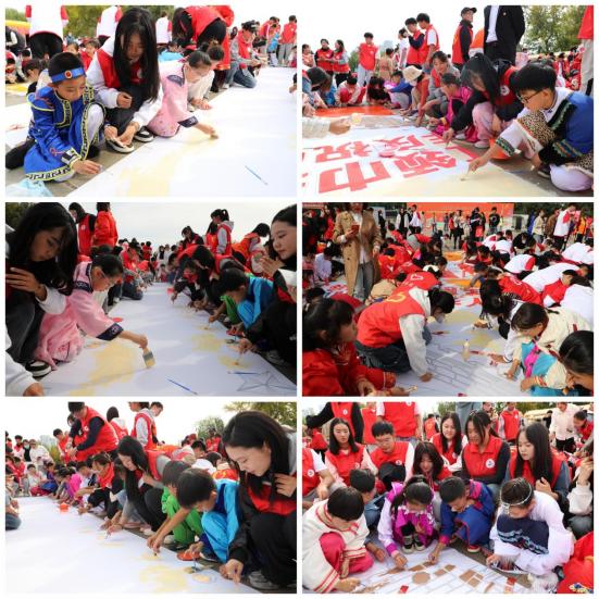 学校志愿者牵着参加活动的小学生,共同在巨画上创作。同学们用丙烯颜料进行起稿铺色,小朋友在学校志愿者的带领下认真勾勒线条、填涂颜色,画出青年与少年的朝气蓬勃。