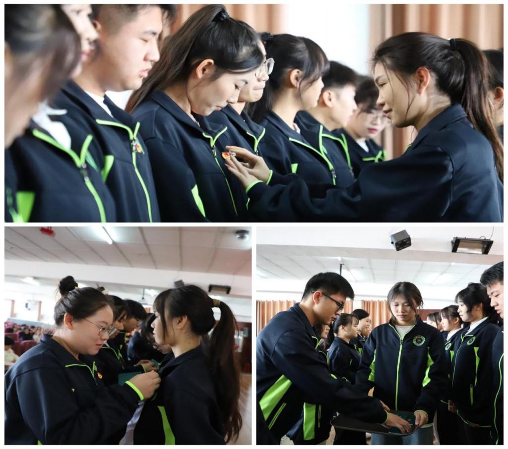 老团员代表为新团员代表佩戴团徽、颁发团员证,新团员正式加入团组织,并肩负起新时代赋予的使命和责任。