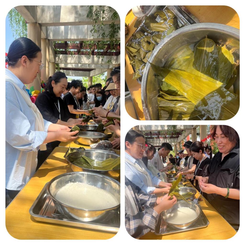 随后,同学们纷纷动手体验包粽子的乐趣,巧手翻飞间,翠绿的粽叶被折成精巧的漏斗状,填入晶莹的糯米与甘甜的蜜枣,再用粽绳细细缠绕捆扎。虽然新手们包出的粽子形态憨态可掬、各具特色,但欢声笑语中洋溢着浓浓的节日氛围,现场其乐融融。