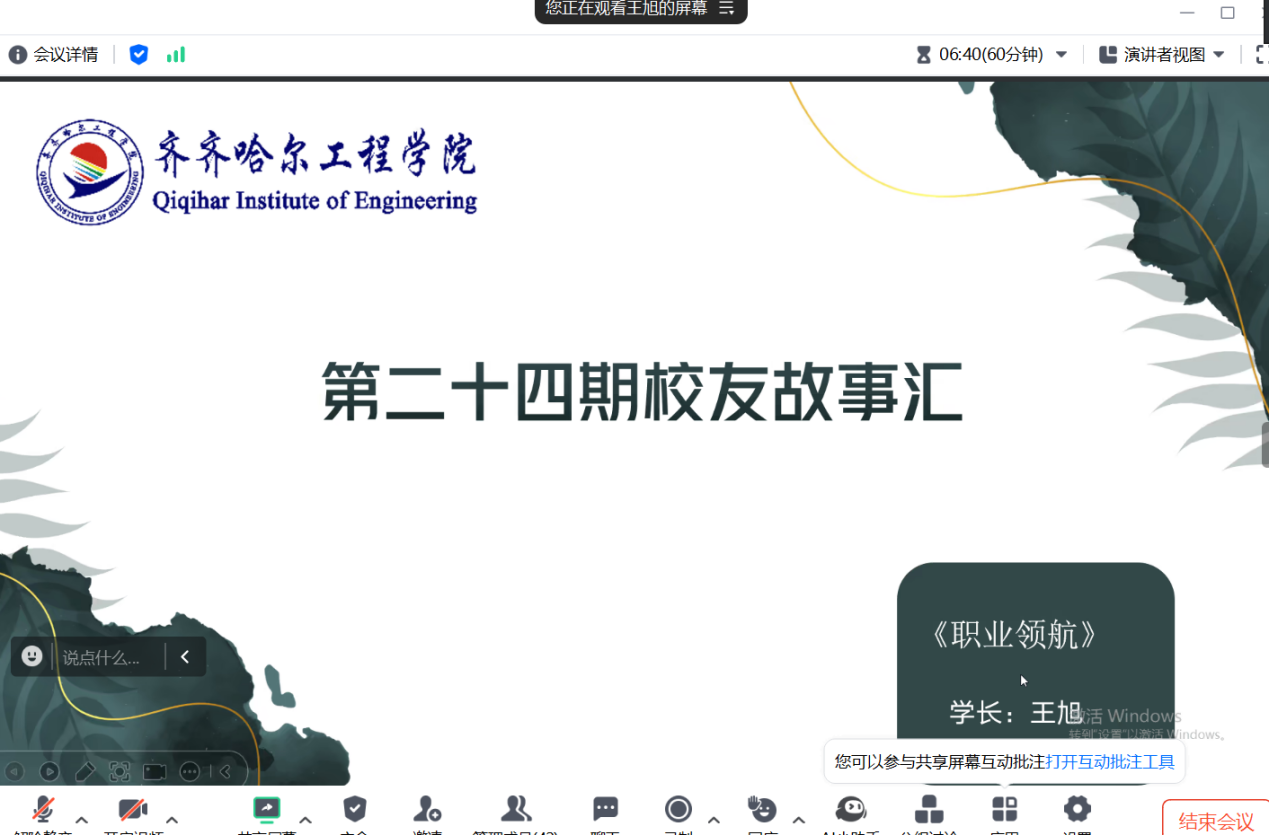 近日,学校举办第二十四期校友故事汇。机电工程系机械设计制造及其自动化专业邀请2023届优秀毕业生王旭在线上为大三学生以“职业领航”为题,分享他的职业发展之路。教师郝岩利主持。