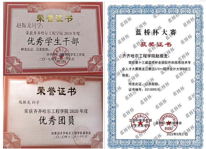 在校期间他积极参与各类校园活动,展现出卓越的组织能力和团队协作精神,曾荣获“优秀学生干部”“优秀团员”等荣誉称号,竞赛方面曾荣获第十三届蓝桥杯全国软件和信息技术专业人才大赛黑龙江赛区C/C++程序设计大赛B组三等奖、第四届传智杯全国大学生IT技能大赛全国区域赛优秀奖。