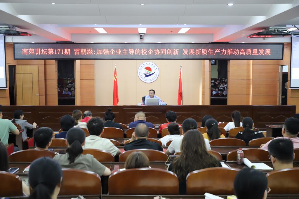6月15日下午,学校南苑讲坛第171期在图书馆601报告厅举行,中国产学研合作促进会常务副会长、教育部科学技术与信息化司原司长雷朝滋来校作讲座。学校领导、骨干学习班成员、教学单位教师代表现场聆听,其他教职工通过线上方式参会。讲座由科研处处长张平主持。雷朝滋以“加强企业主导的校企协同创新发展新质生产力推动高质量发展”为题,从高等教育与基础教育的主要区别等问题切入,深入探讨了现代高等教育的核心特征与科教融...