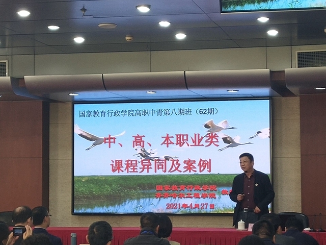 4月27日上午,理事长曹勇安教授应邀在国家教育行政学院第六十二期高校中青年干部培训班(高职中青第八期)作题为《中、高、本职业类课程异同及案例》专题报告,来自全国共计85名学员聆听报告。 曹勇安理事长报告通过...