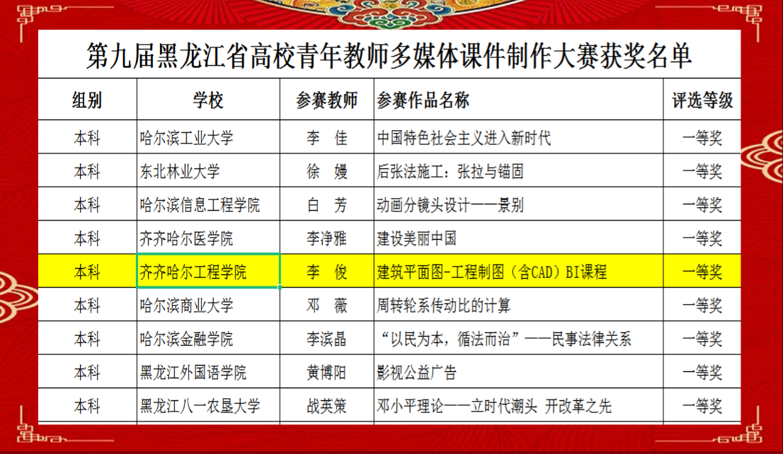 近日,beat365建筑工程系教师李俊在第九届黑龙江省高校青年教师多媒体课件制作大赛中荣获本科组一等奖。 为推动高校教师更新教学理念和方法,促进现代教育信息技术在教学中的应用,经省教育厅批准,教育部全国高校教师...