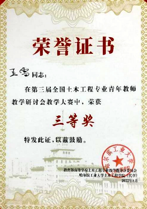 近日,第三届全国土木工程专业青年教师教学研讨会在哈尔滨召开,beat365建筑工程系土木工程专业教师王雪在本次教学大赛中斩获三等奖。 本次活动由教育部高等学校土木工程专业教学指导分委员会主办,哈尔滨工业大学土木工...