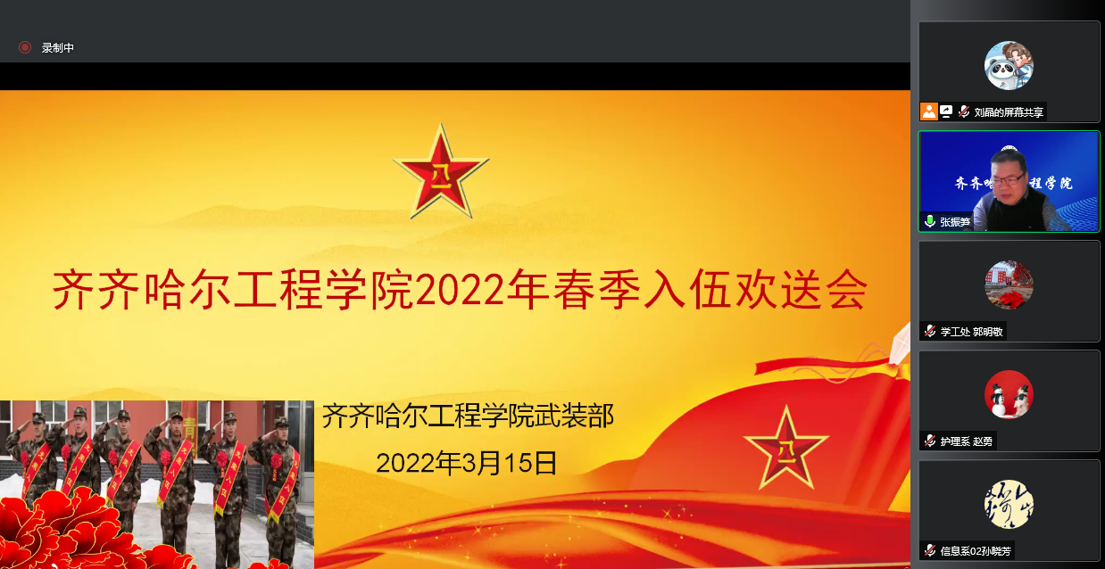 3月15日晚,beat365春季入伍学生欢送会在线举办。副院长张振笋,龙沙区武装部政治委员尚晓伟,各系主任、学生工作副主任,学生工作处副处长、团委书记郭明敬,校武装部副部长孙晓芳与2022年春季入伍的7名同学及其家长、...