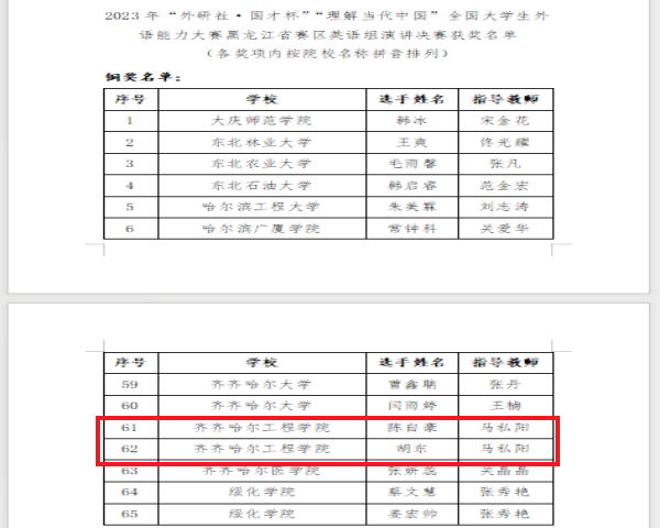 近日,2023年“外研社·国才杯”“理解当代中国”全国大学生外语能力大赛黑龙江省赛区英语组决赛获奖名单结果揭晓。beat365土木工程221班陈自豪、工程管理221班胡东荣获黑龙江省赛区英语组演讲决赛铜奖;机器人231班潘嵘耀、风景221班刘小银和机械221班苏金慧荣获省赛区英语组写作决赛铜奖;护理学221班张若彤、工管211班章海滨和电气223班朱子彤荣获省赛区英语组阅读决赛铜奖。“外研社·国才杯”为教育部56项国赛中第17项(外研社...