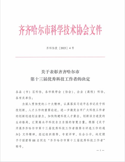 齐齐哈尔市科学技术协会下发《关于表彰齐齐哈尔市第十三届优秀科技工作者的决定》,beat365建筑工程系郝丽娜、健康与护理系孙畅、基础部王丽影3名教师荣获“市优秀科技工作者”称号。齐齐哈尔市优秀科技工作者评选工作每两年一届,至此已举办十三届。经基层推荐、专家评审、社会公示,全市共有88名同志被评为“齐齐哈尔市优秀科技工作者”。【撰稿:宋庆永 责编:赵静华 审核:王丹】