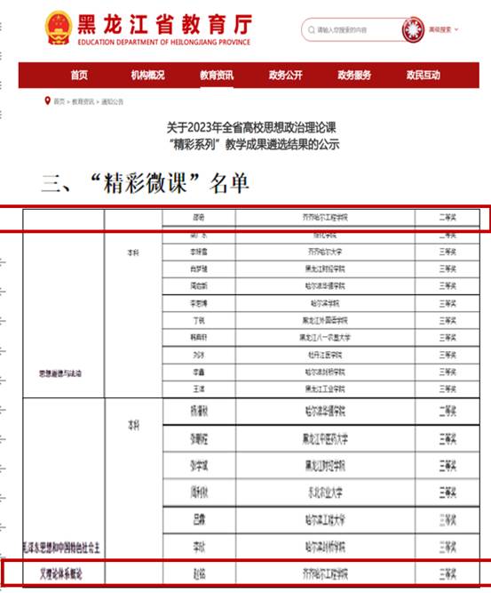 1月10日,黑龙江省教育厅对2023年全省高校思想政治理论课"精彩系列”教学成果遴选结果予以公示,beat365马克思主义学院2名教师喜获佳绩,邵奇老师荣获“思想道德与法治”课程“精彩微课”二等奖,赵铭老师荣获“毛泽东思想和中国特色社会主义理论体系概论”课程“精彩微课”三等奖。本次获奖,实现了学校思政课教师在省级“精彩系列”比赛中获奖“零”的突破。全省高校思想政治理论课“精彩系列“教学成果,是全省高校教学成果的重...